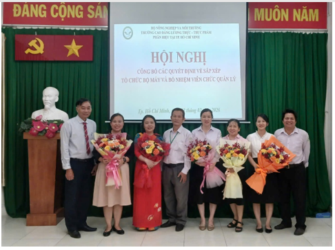Thực hiện công tác về sắp xếp, tinh gọn bộ máy theo hướng hiệu lực, hiệu quả, tiến tới tự chủ tài chính, Phân hiệu triển khai sắp xếp, tinh gọn bộ máy đến nay đã hoàn thành. Được sự thống nhất của Ban Giám hiệu Nhà trường, ngày 02/02/2026 Phân hiệu Trường Cao đẳng Lương thực – Thực phẩm tại Thành phố Hồ Chí Minh, tổ Hội nghị Công bố các quyết định về chức nănh nhiệm vụ, cơ cấu tổ chức và bổ nhiệm viên chức quản lý.