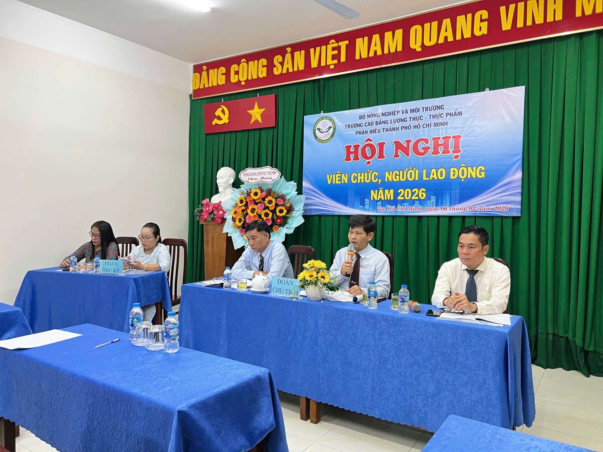 Ngày 06/02/2026, trong không khí dân chủ, đoàn kết và trách nhiệm, Hội nghị Viên chức, Người lao động năm 2026 của Phân hiệu Trường Cao đẳng Lương thực – Thực phẩm tại Thành phố Hồ Chí Minh đã được tổ chức nhằm đánh giá kết quả thực hiện nhiệm vụ năm 2025, đề ra phương hướng, nhiệm vụ năm 2026 và thảo luận, quyết định các nội dung quan trọng liên quan đến quyền lợi, trách nhiệm của viên chức và người lao động.